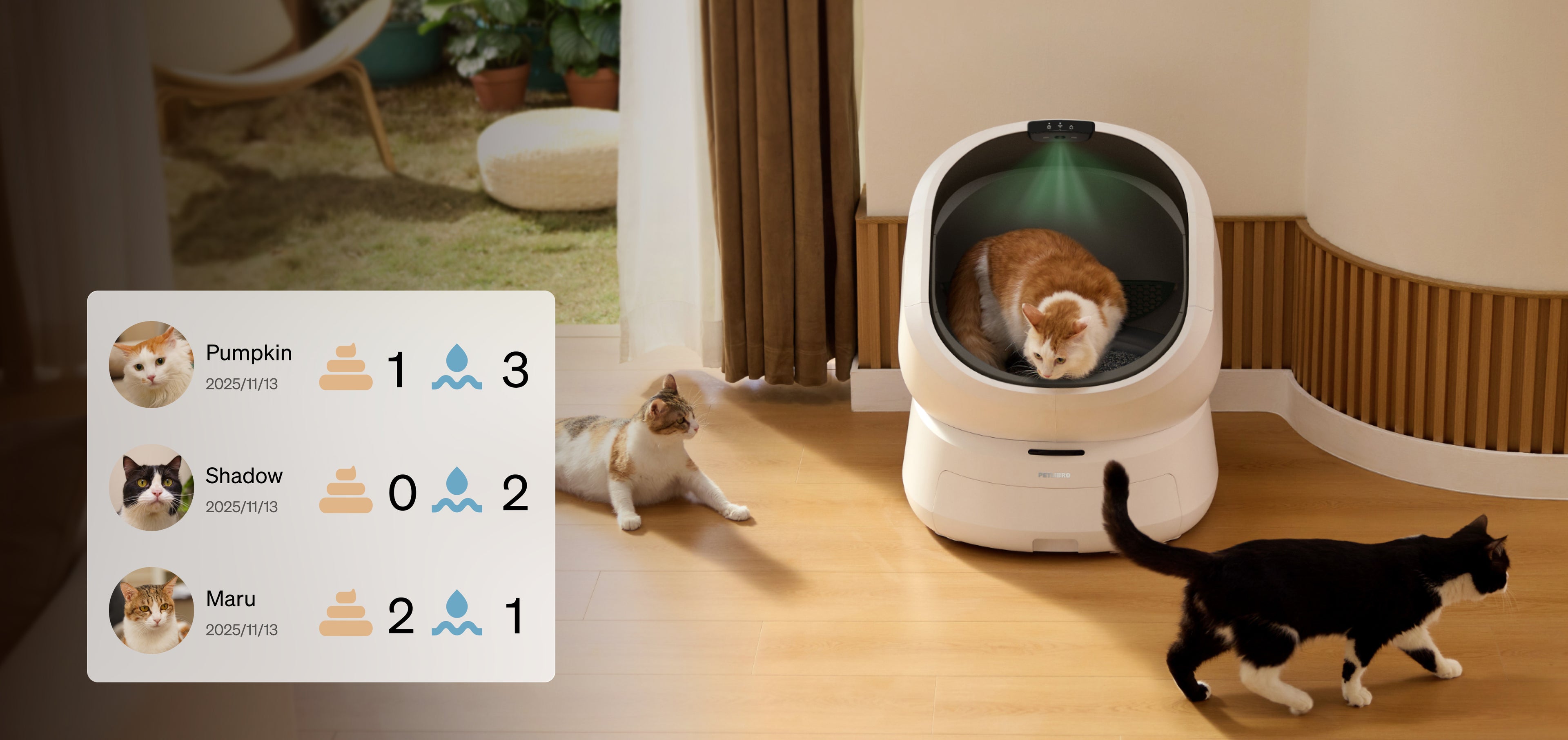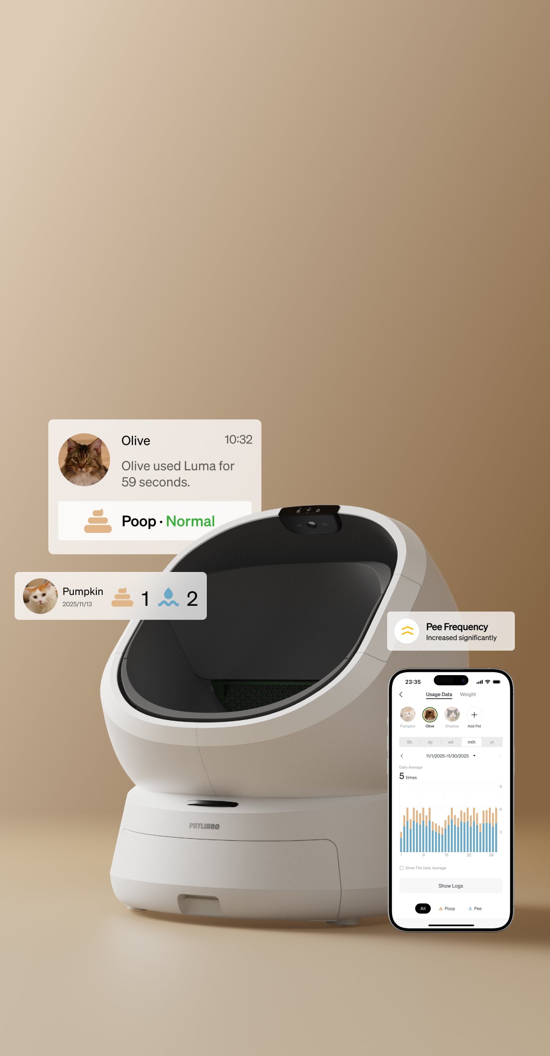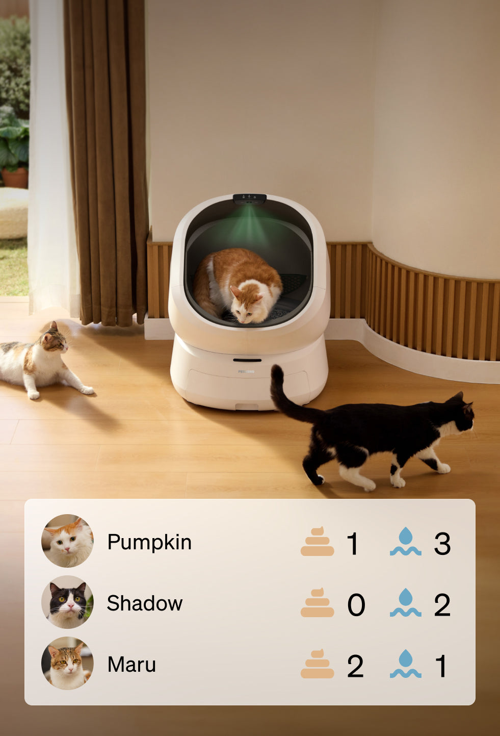 Every detail, every cat. Luma recognizes up to 10 cats and logs their litter box visits by name.