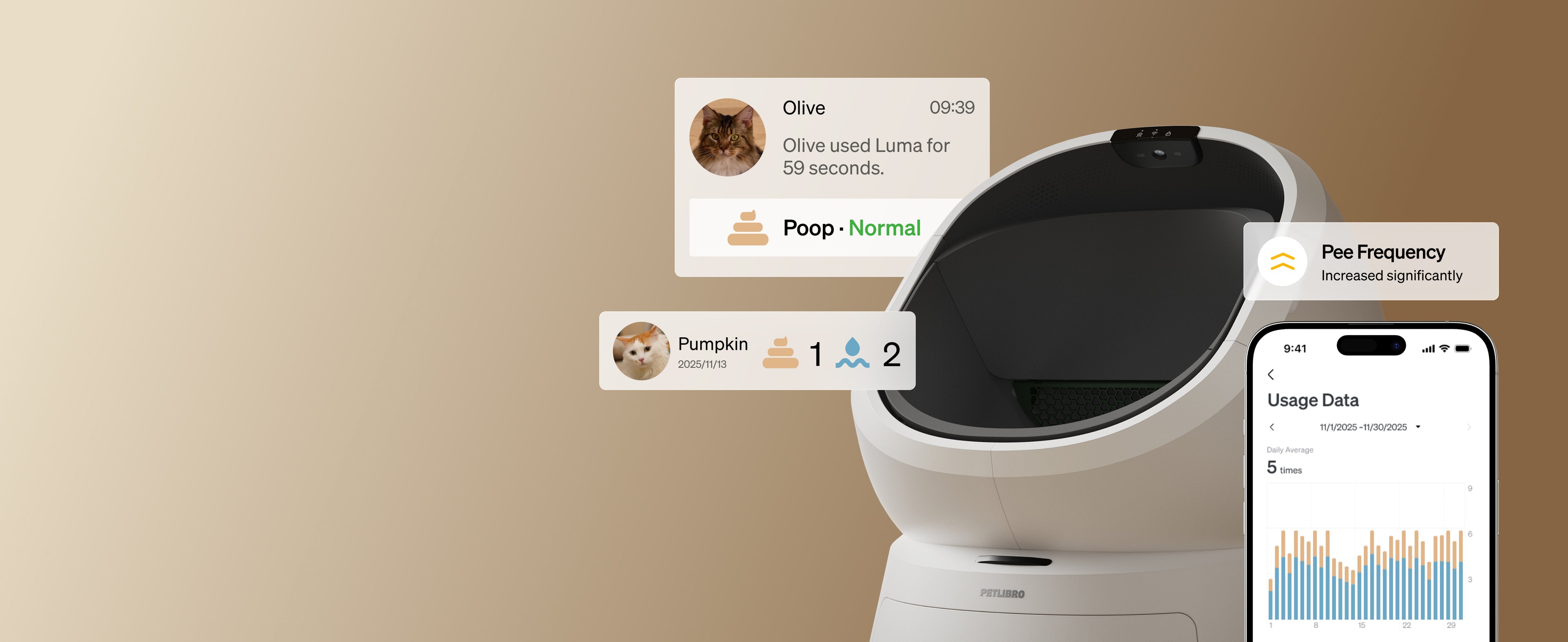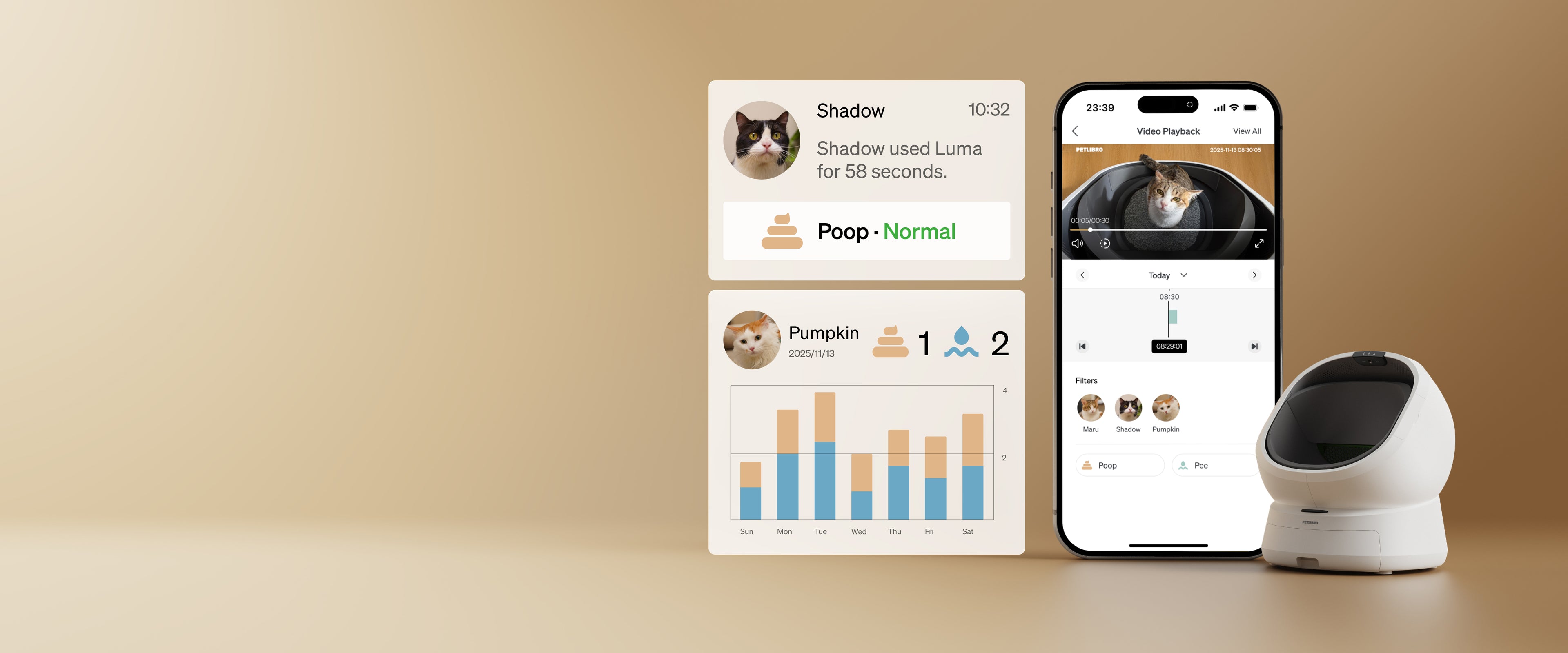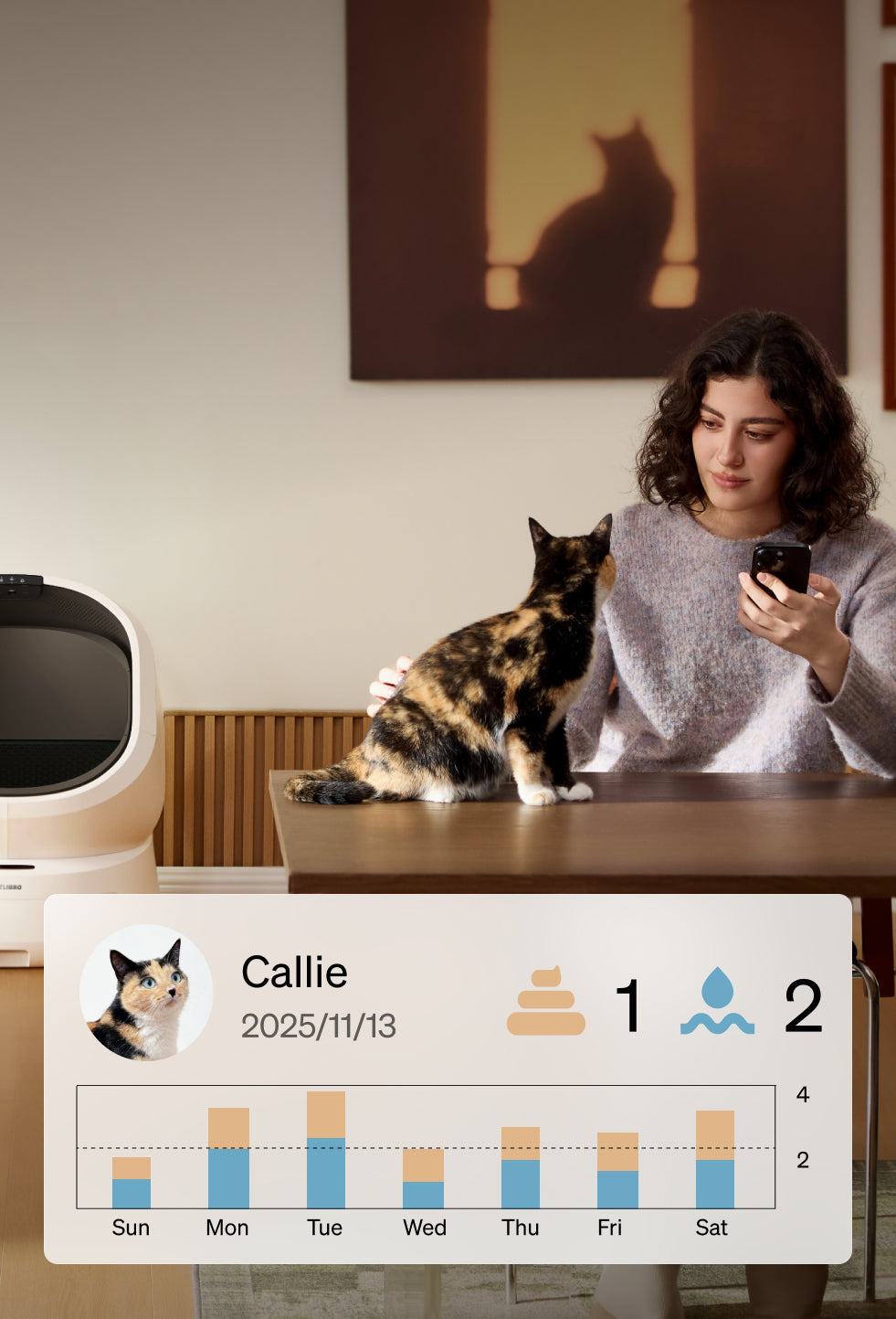 Every detail, every cat. Luma recognizes up to 10 cats and logs their litter box visits by name.
