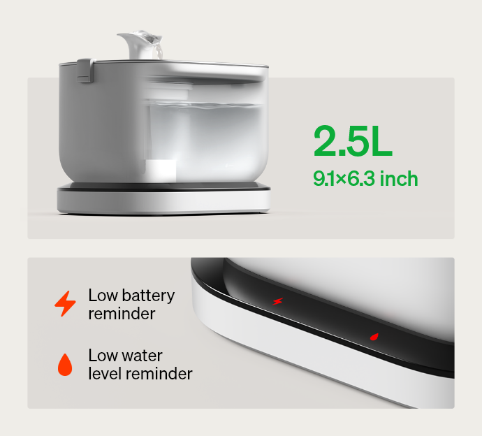 1. The filter and the foam filter must be replaced every 2 weeks. 2. The pump and fountain should be cleaned every 2 weeks. 3. The water dispenser has a built-in rechargeable battery, please read the user manual carefully before use. 4. When using the machine's battery-operated capabilities for the first time, first ensure it is fully charged. If you need to use it immediately, you can connect the external power cord, charge the water fountain while working, and then unplug it when it is fully charged. 5. To extend the life of pump, please add water before starting the machine.