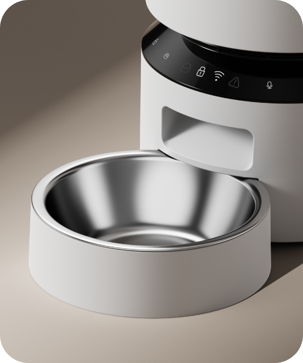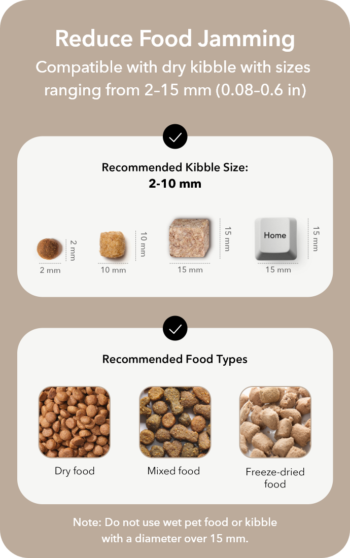 The equally divided vane design and wide food outlet help prevent food jamming, ensuring smooth food dispensing. In the event of a food jam, the app will display a pop-up message to alert you. We recommend using cat food sizes ranging from 2–15mm (0.08–0.6in) in diameter.