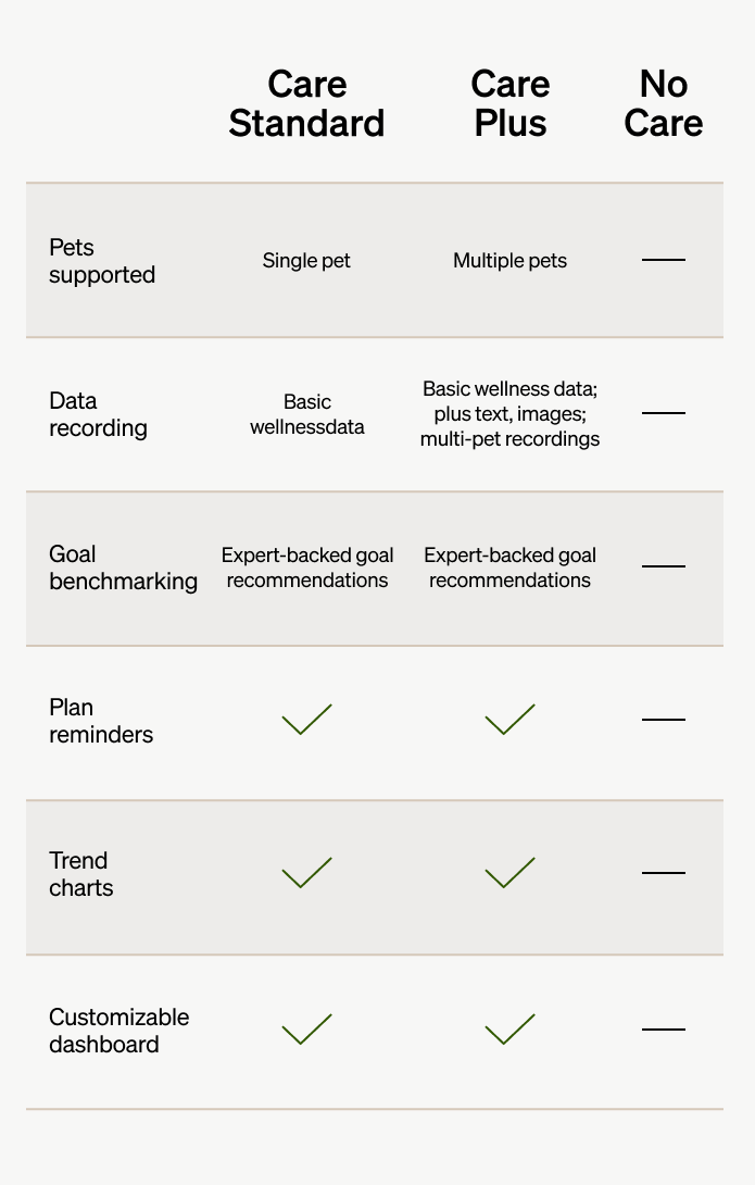 Set wellness goals for your pet, compare them to expert standards, and monitor their progress step by step.